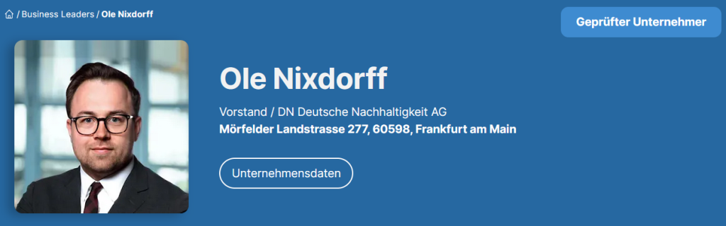 Die DN Deutsche Nachhaltigkeit AG ist eine börsennotierte Impact-Investment-Gesellschaft mit Sitz in Frankfurt am Main, die sich auf Beteiligungen an Unternehmen mit nachweisbarem, positivem Umwelt- und Gesellschaftseinfluss fokussiert. Sie investiert in Sektoren wie erneuerbare Energien, nachhaltige Mobilität, Gesundheit, Infrastruktur und Ernährung, mit besonderem Augenmerk auf Projekte, die strenge ESG-Standards erfüllen. Für Privatanleger bietet sie durch börsengehandelte Anleihen Zugang zum Zukunftsmarkt Impact Investing. CEO ist Ole Nixdorff.