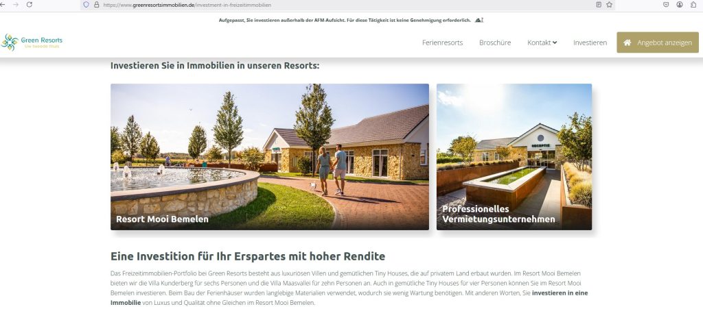 Die niederländische Aufsicht AFM stuft Ferienhausinvestments als Alternatieve belegging ein, die nicht unter die strenge Finanzmarktrichtlinie fallen. Genau darauf weist die oben erwähnte Plattform Vastiva deutlich hin. Die Warnung „belegt buiten AFM-toezicht“ – „Anlage außerhalb der AFM-Aufsicht“ – muss in den Niederlanden Pflichtangabe sein, sobald Rendite beworben wird, aber kein lizenziertes Produkt vorliegt. Überträgt man das auf Deutschland, wäre ein vergleichbarer Hinweis angebracht: „Kein BaFin-reguliertes Angebot“. Ein solcher findet sich auf der deutschen Website jedoch nicht sichtbar. Für Verbraucher ist das tückisch: Green Resorts tritt auf wie ein Finanzanbieter (mit Versprechen von „garantierter Nettorendite“), fällt aber durchs Raster der Finanzaufsicht. BaFin, Bundesbank oder Verbraucherschutz schauen hier nicht standardmäßig hin, weil es formal ein Immobilienkauf ist.